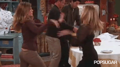 Since Monica and Chandler are secretly dating in this episode, they both feel pretty awful knowing each others worst Thanksgivings, so Monica ends up (somehow) getting a turkey on her head and shimmying for Chandler. This results in Chandler blurting out, "I love you," which hilariously has Monica freaking out with a turkey still on her head. It's a classic scene, so romantic and genuinely funny.